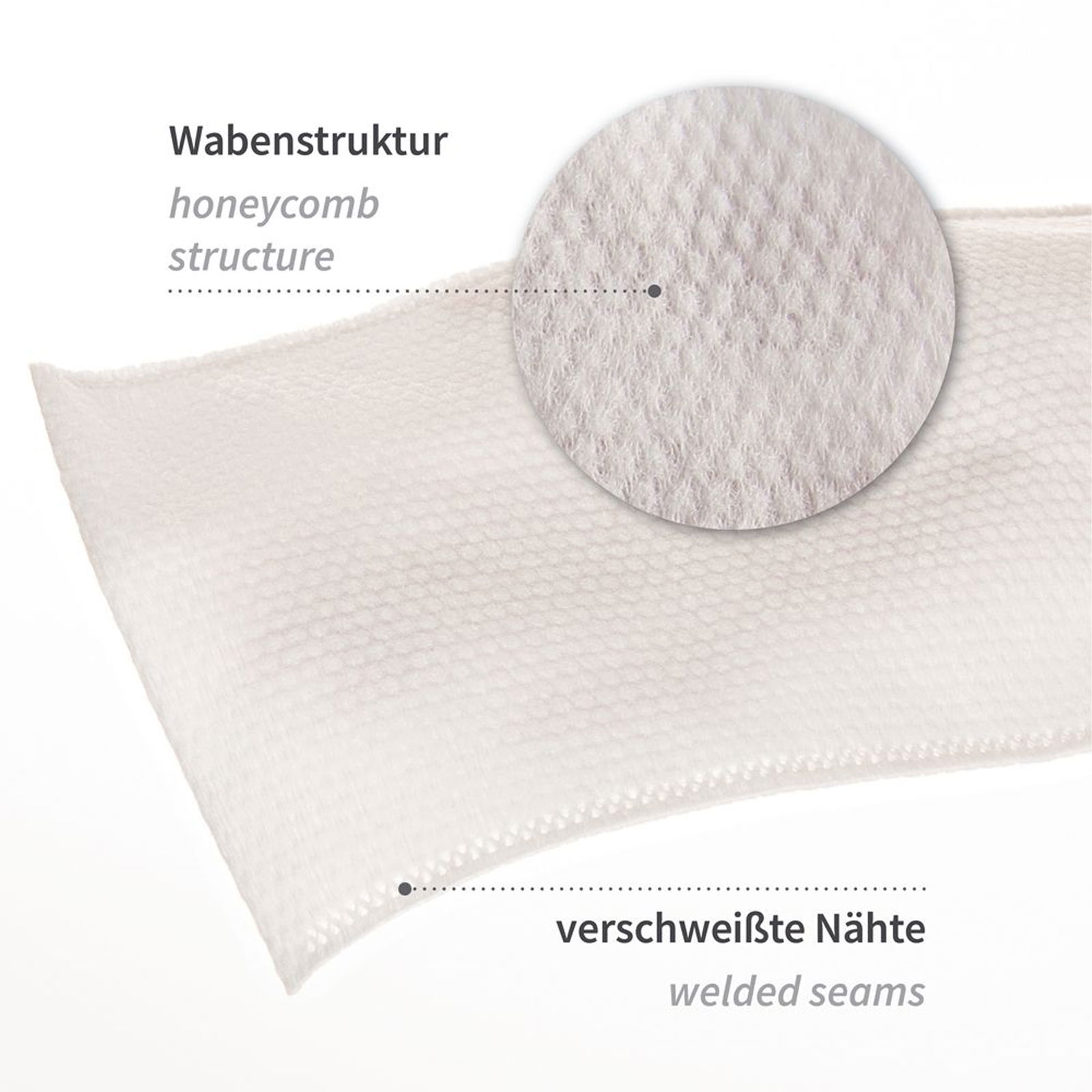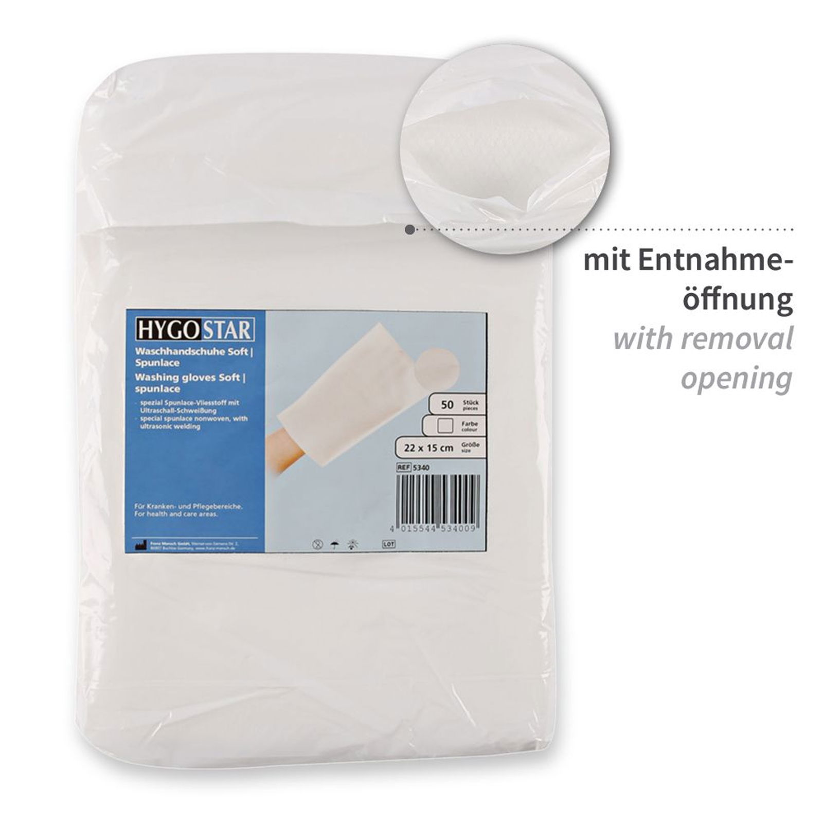 The Soft wash gloves made of spunlace from Hygostar have been a proven standard in patient and body care for years. Their particularly soft, fluffy material ensures a pleasant feeling on the skin and thorough, gentle cleaning. The honeycomb structure on the outside effectively absorbs dirt and keeps it safely inside the glove.