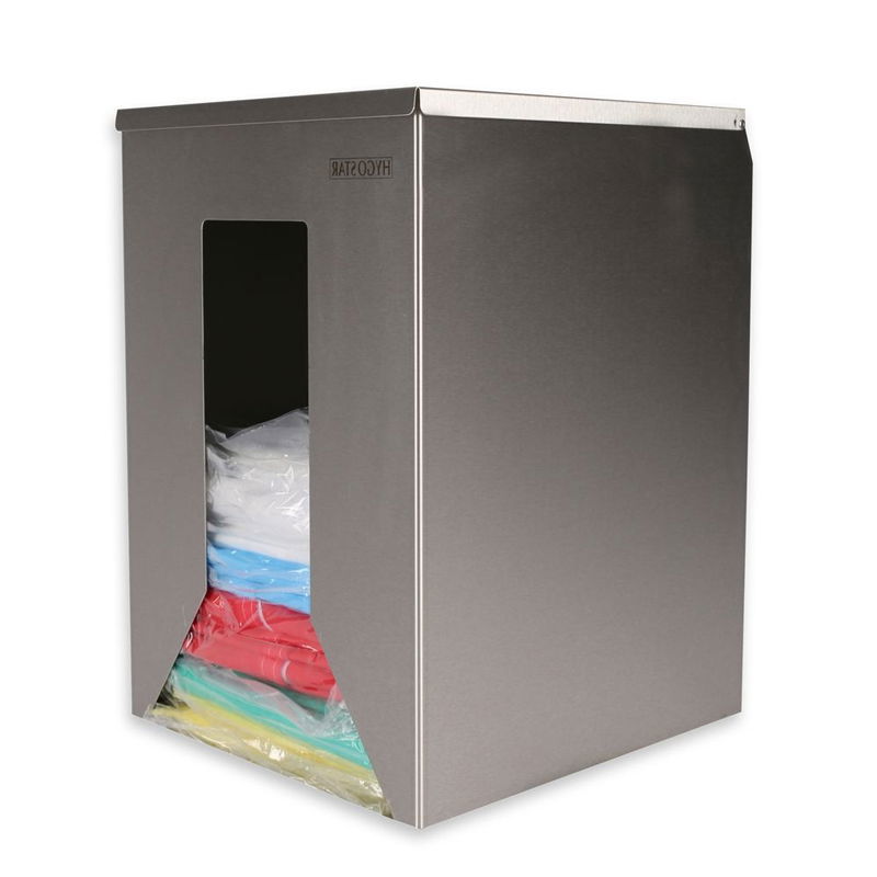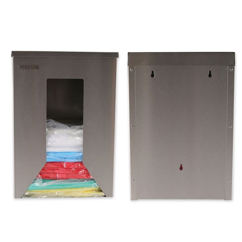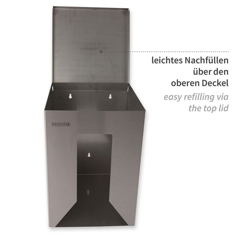 The dispensers for gowns and overalls from Hygostar are made of high-quality stainless steel. They store all large items of clothing such as loose visitor gowns, surgical gowns or disposable overalls. Thanks to the viewing window on the front of the wall holder, you can see the contents and fill level at all times. The stainless steel wall holder is equipped with a large removal opening and can be easily refilled via the top flap.