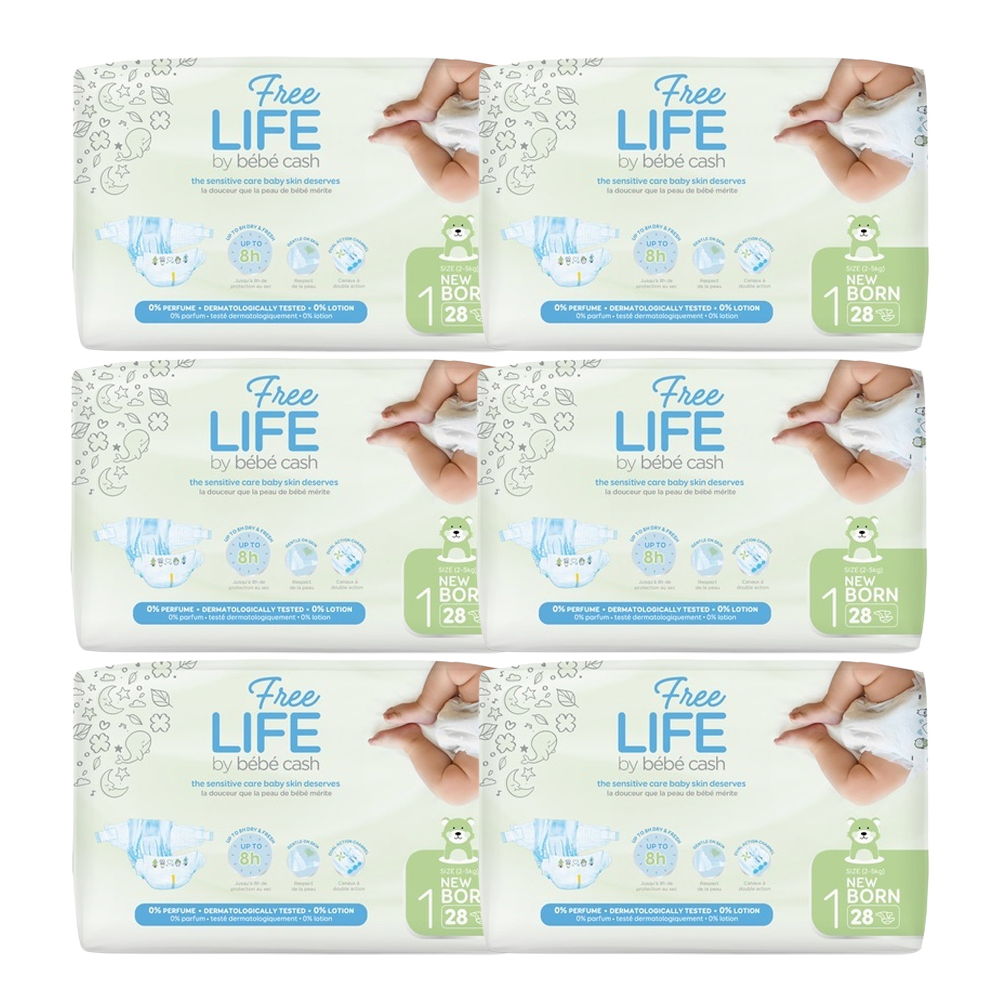 BBCash Freelife New Born nappies are designed for newborns weighing between 2 and 5 kg and offer particularly gentle, safe protection in the first few weeks. An extra absorbent layer and a high-performance absorbent core with superabsorbent absorb liquid quickly and ensure pleasantly long-lasting dryness. Soft inner fleece, good breathability as well as elasticated side cuffs and flexible soft elasticated parts support high wearing comfort with reliable support. Additional cuffs and side barriers significantly improve leakage protection. The reclosable Velcro fasteners for quick checks and easy changing are practical for everyday use. The extra soft cuffs in the navel area are designed for the sensitive early days. The nappies are chlorine-free, dermatologically tested and fragrance-free.