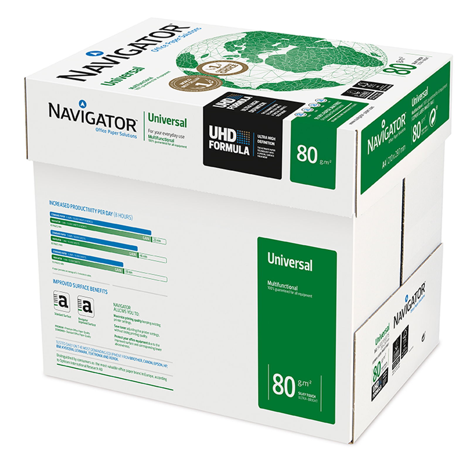 The copy paper for all devices - with an improved surface and silky feel, Navigator Universal paper is multifunctional. It is guaranteed to be 100% suitable for all copiers and printers as well as all document types. Thanks to its smooth and homogeneous structure, the paper with CIE 169 whiteness delivers an even print image for text and color images.