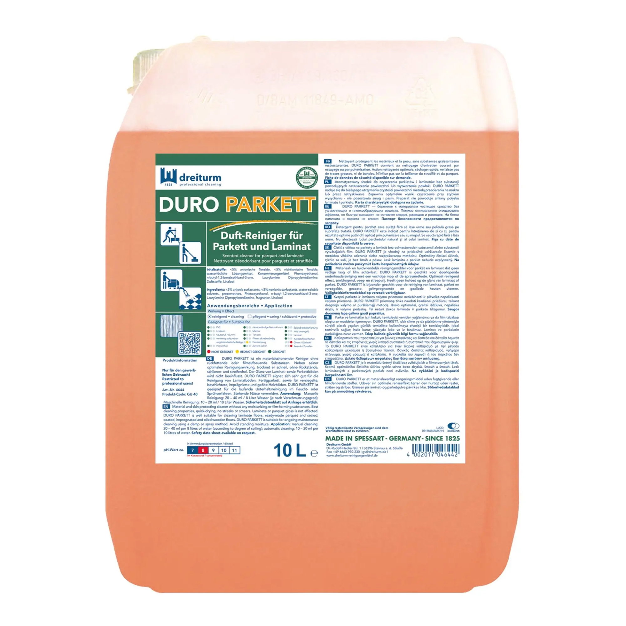 DURO PARKETT is a gentle scented cleaner for parquet and laminate floors and is ideal for daily maintenance cleaning. It reliably removes dirt without damaging the surface or leaving any residue. The cleaned surfaces dry quickly and remain free of streaks and smears. The special formulation does not contain any moisturising or film-building substances, so that the natural shine of parquet and laminate is retained. This makes the cleaner particularly suitable for high-quality floor coverings where appearance and care play an important role. DURO PARKETT is versatile and suitable for damp wiping and spraying. It can be used on laminate, finished parquet as well as on sealed, coated, impregnated and oiled wooden floors. A reliable solution for gentle and efficient cleaning in the professional and private sector.