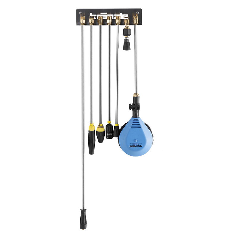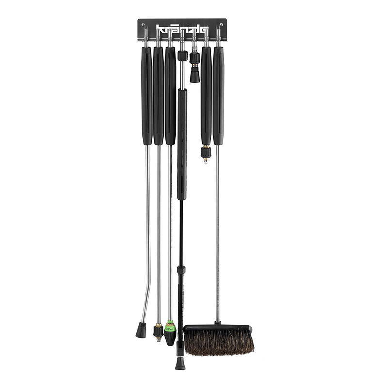 Le support mural est la solution idéale pour ranger jusqu'à sept lances et brosses de lavage en économisant de l'espace. Elle est livrée avec un support pour pistolet D12.