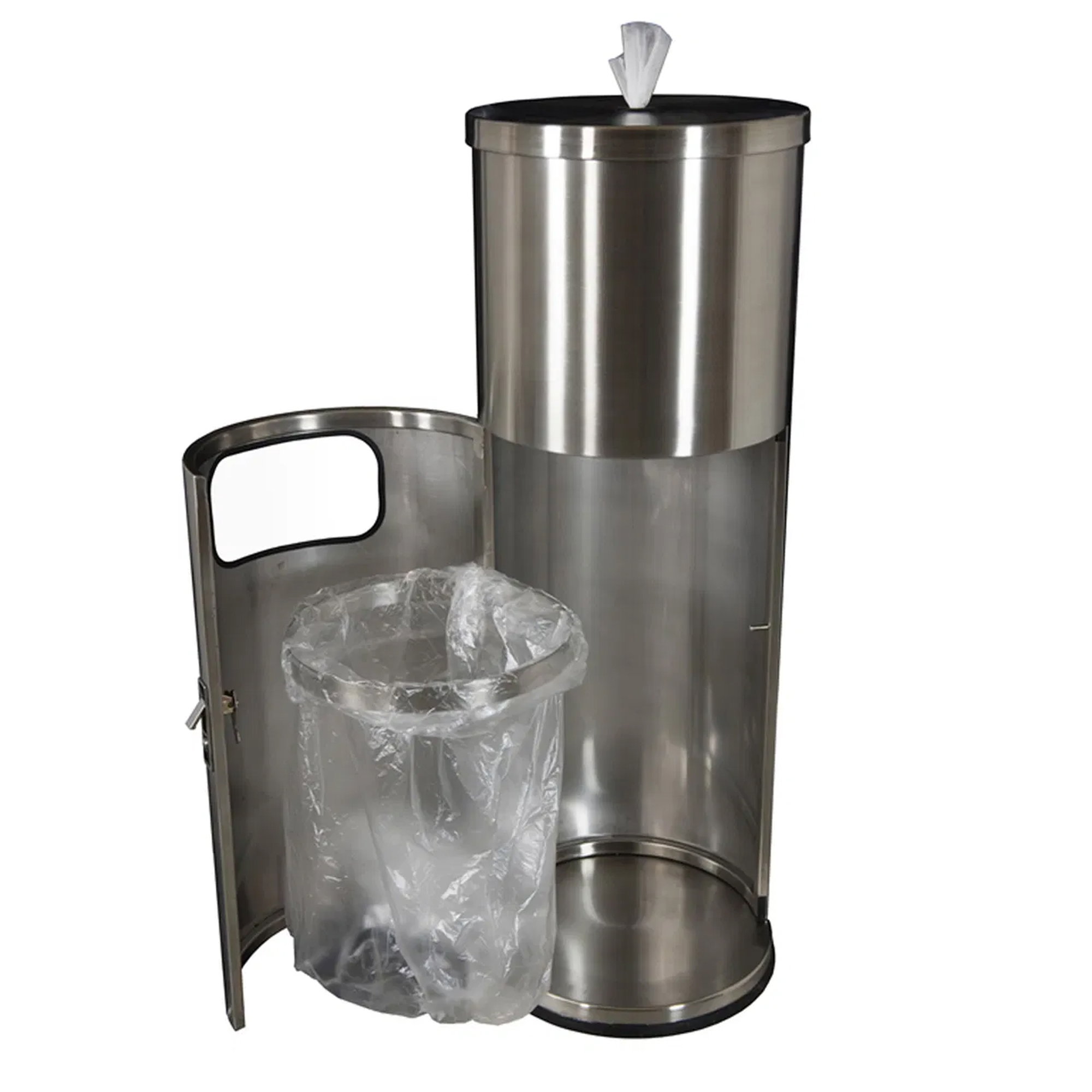 Die Hygowipes Desinfektionsstation aus geschliffenem Edelstahl im attraktiven 3 in 1 Konzept. Die Hygienestation für Flächendesinfektion und Abfalleimer ist ideal geeignet für Fitnesscenter.