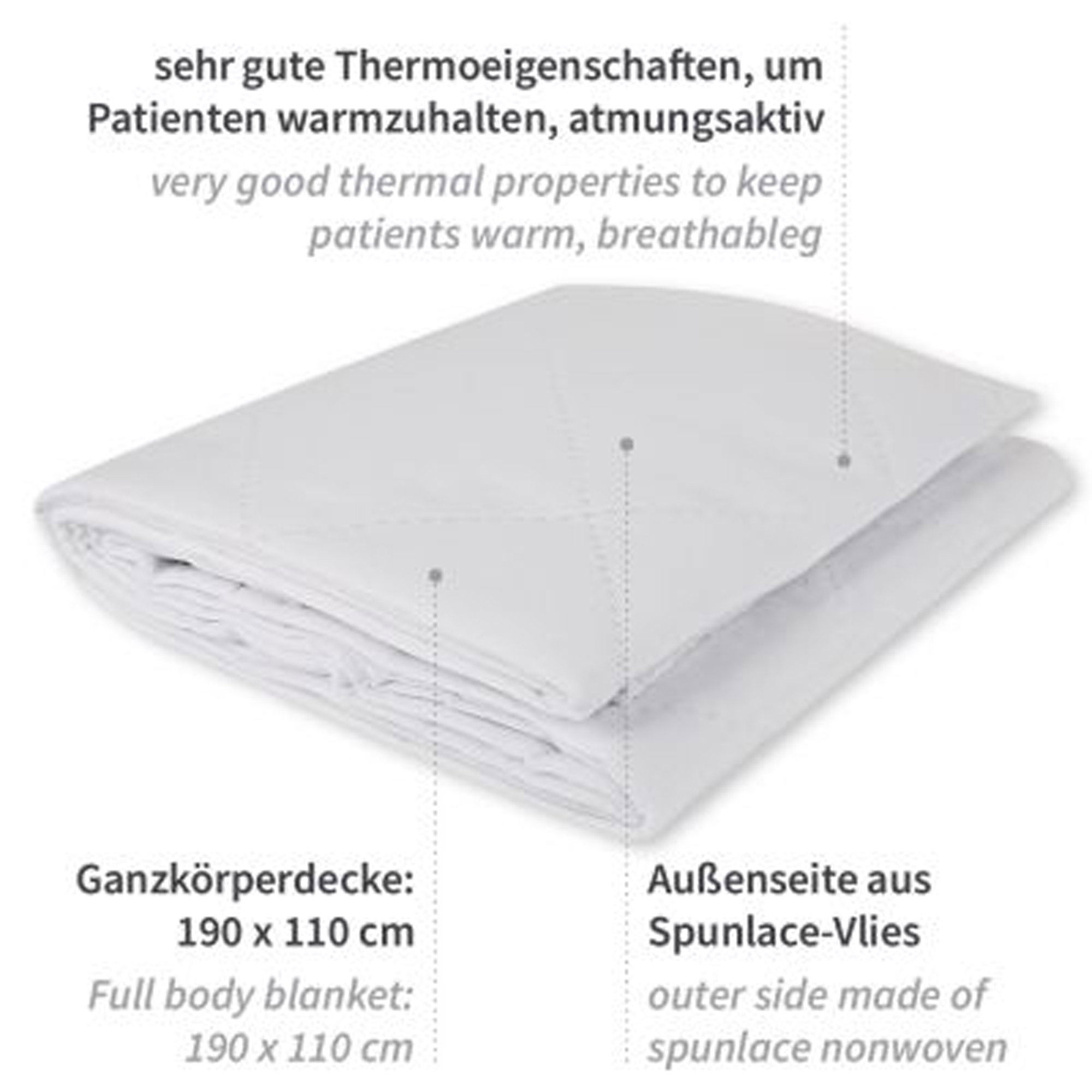 Le coperte sono realizzate in morbido pile spunlace all'esterno e in una calda imbottitura di ovatta di poliestere all'interno. Sono traspiranti, resistenti e forniscono un calore confortevole durante gli esami, le operazioni o il trasporto. Ogni coperta è confezionata singolarmente in modo igienico, il che rende lo stoccaggio e la distribuzione particolarmente pratici e puliti.