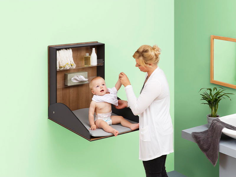 Il robusto fasciatoio può essere fissato alla parete in modo flessibile e poco ingombrante grazie al binario in acciaio in dotazione. Può essere montato a qualsiasi altezza, in modo che i genitori possano cambiare i pannolini in modo agevole per la loro schiena. Puoi facilmente aprire e chiudere il fasciatoio con un semplice gesto del polso. I freni a ribalta incorporati assicurano che il piano fasciatoio non possa cadere in modo brusco. Quando non viene utilizzato, il fasciatoio rimane ripiegato e occupa pochissimo spazio. Due ripiani integrati in vetro acrilico offrono molto spazio per pannolini e prodotti per la cura del corpo.