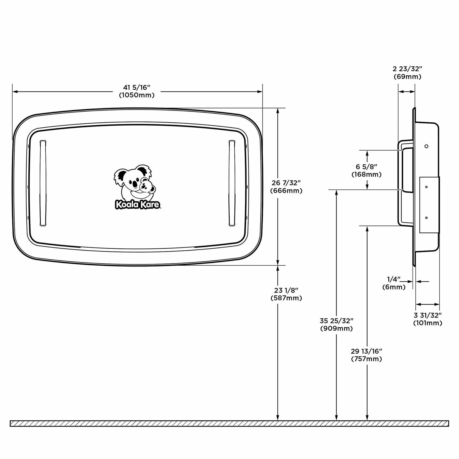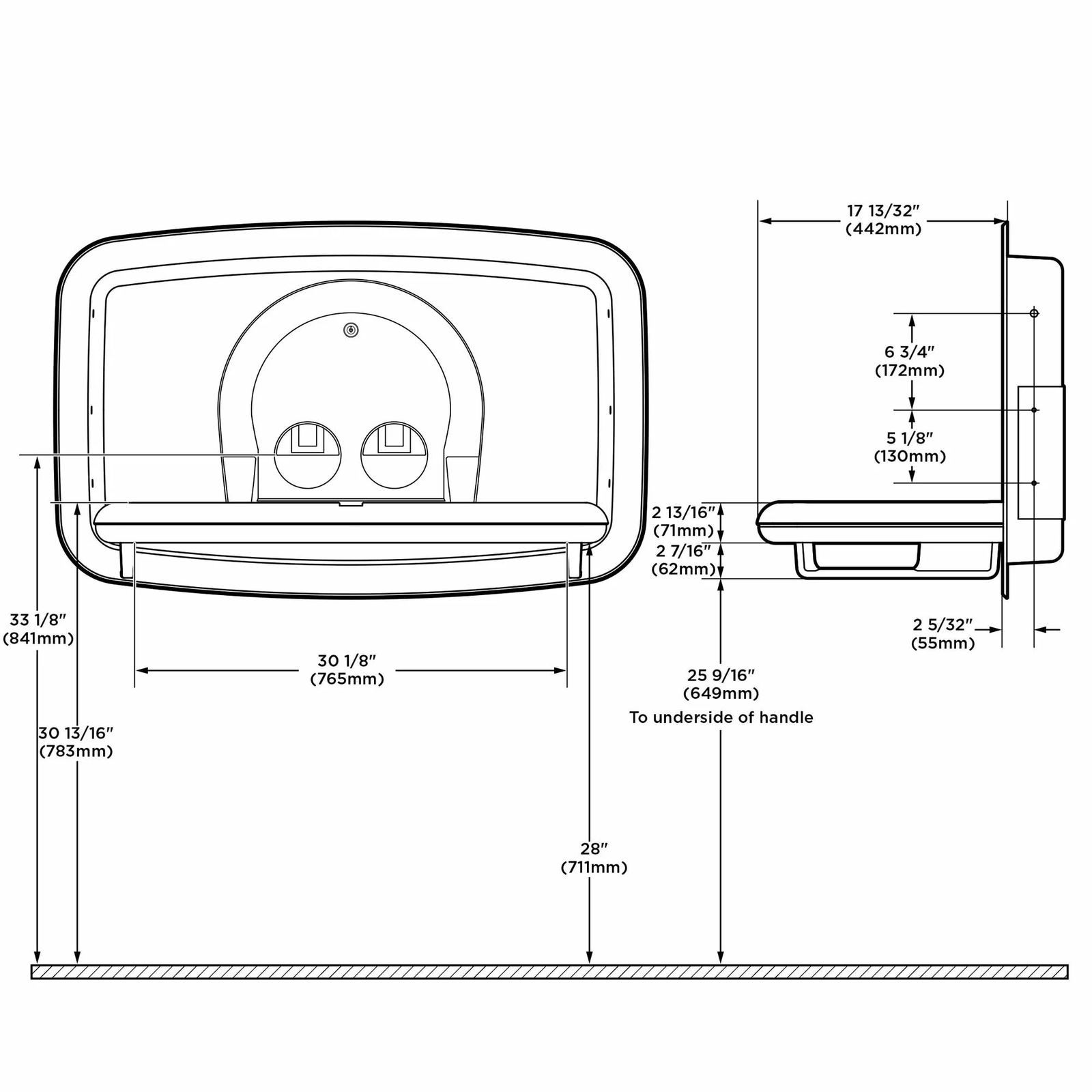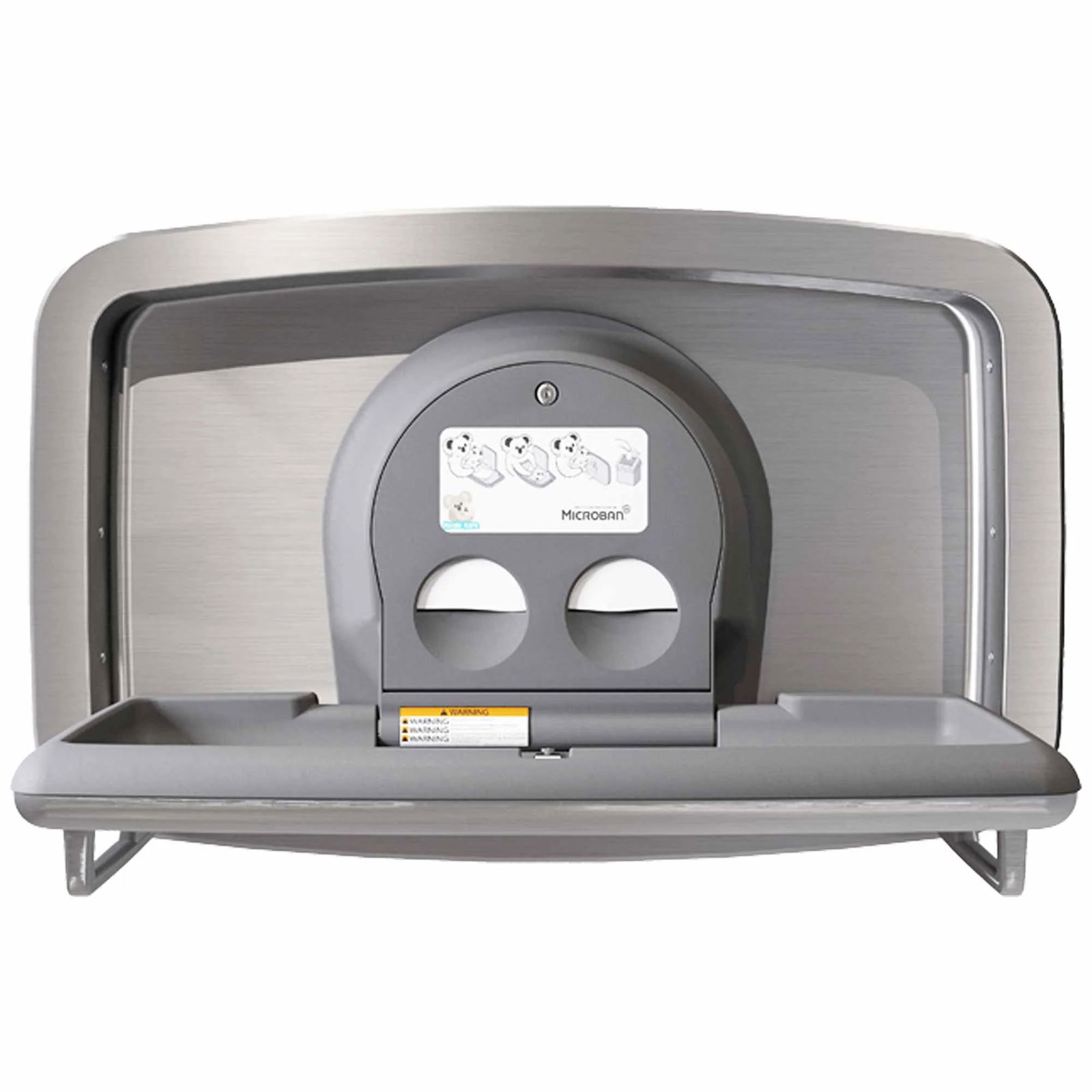 La cavità a doppia fodera è dotata di una linguetta interna a molla che spinge le fodere in avanti consentendo l'erogazione di una sola fodera. Ogni cavità contiene 25 copertine e il meccanismo di chiusura riduce al minimo il riempimento da parte degli utenti e scoraggia gli atti di vandalismo. Il prodotto è dotato di cinghie di sicurezza per bambini. La base del materasso è rivestita esclusivamente con la protezione antimicrobica Microban®, che riduce i batteri che causano cattivi odori e mantiene la base del materasso pulita tra una pulizia e l'altra. Il cilindro pneumatico nascosto consente un'apertura e una chiusura controllata e lenta del fasciatoio.