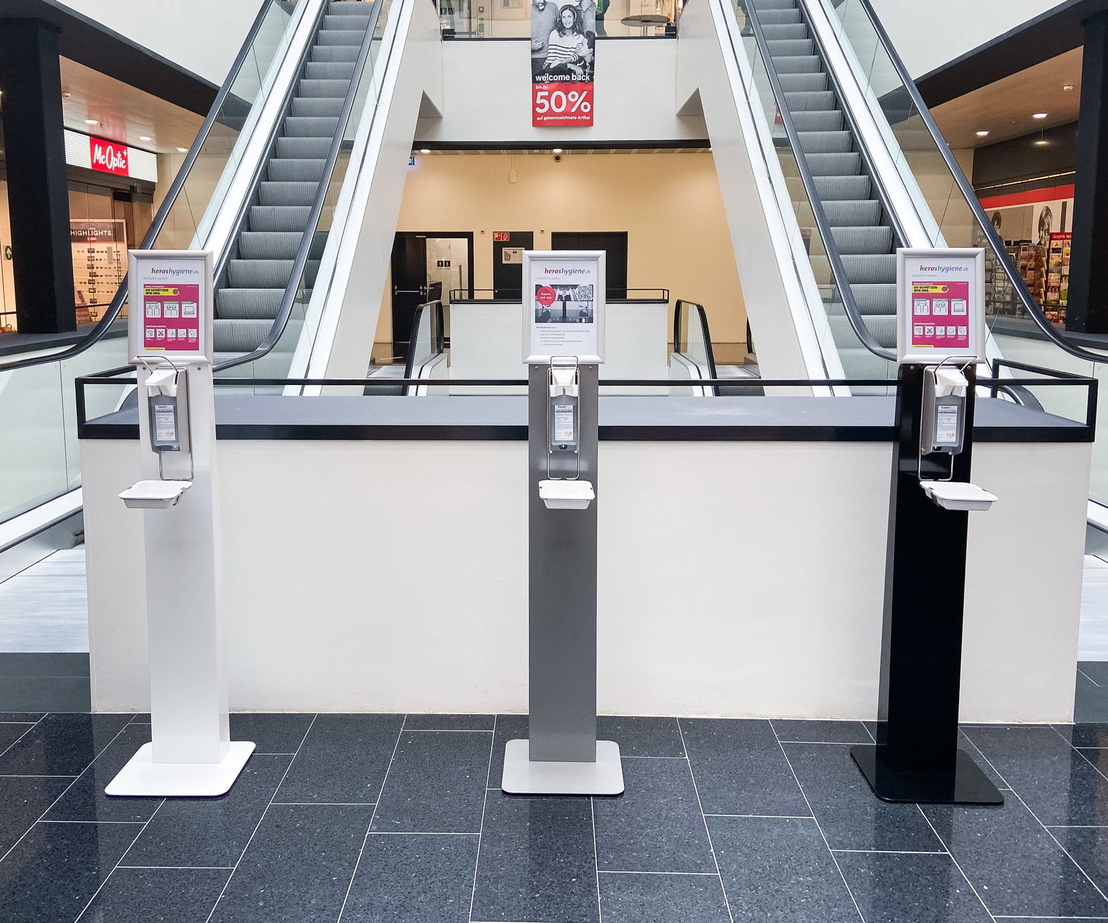 La nostra stazione di disinfezione è prodotta localmente in Svizzera ed è disponibile con verniciatura a polvere nei colori grigio, bianco o nero. Il supporto per la disinfezione è abbinato a un dispenser di disinfezione manuale in alluminio di alta qualità per flaconi Euro da 500 ml o 1000 ml. Con il suo design moderno, il nostro supporto per la disinfezione offre una soluzione molto elegante per garantire gli standard di igiene necessari negli spazi pubblici. La stazione igienica è stabile e comoda da trasportare.