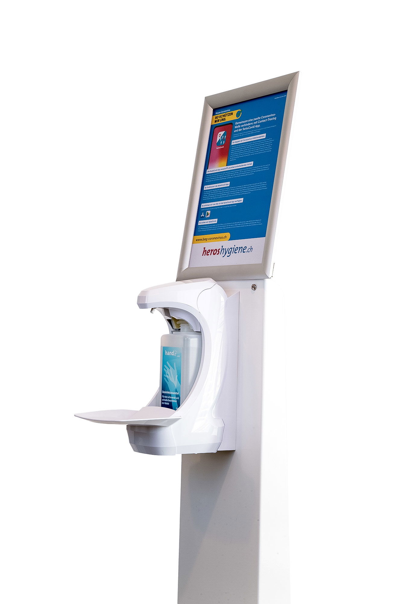 La nostra colonna di disinfezione è realizzata in robusto acciaio inox. La stazione di disinfezione è prodotta localmente in Svizzera ed è disponibile con verniciatura a polvere nei colori grigio, bianco e nero. La colonna di disinfezione è abbinata a un dispenser di disinfezione touchless di alta qualità per flaconi Euro da 500 ml. Con il suo design moderno, la nostra stazione di disinfezione offre la soluzione elegante ideale per garantire gli standard di igiene necessari negli spazi pubblici.