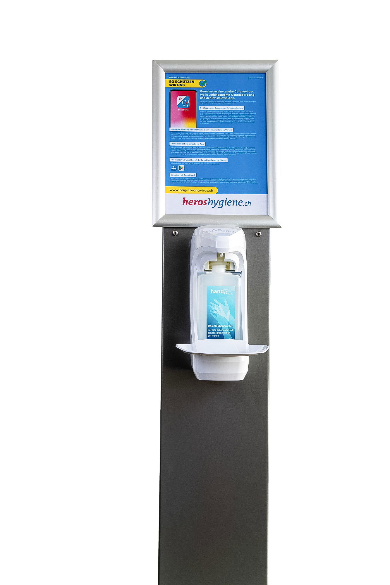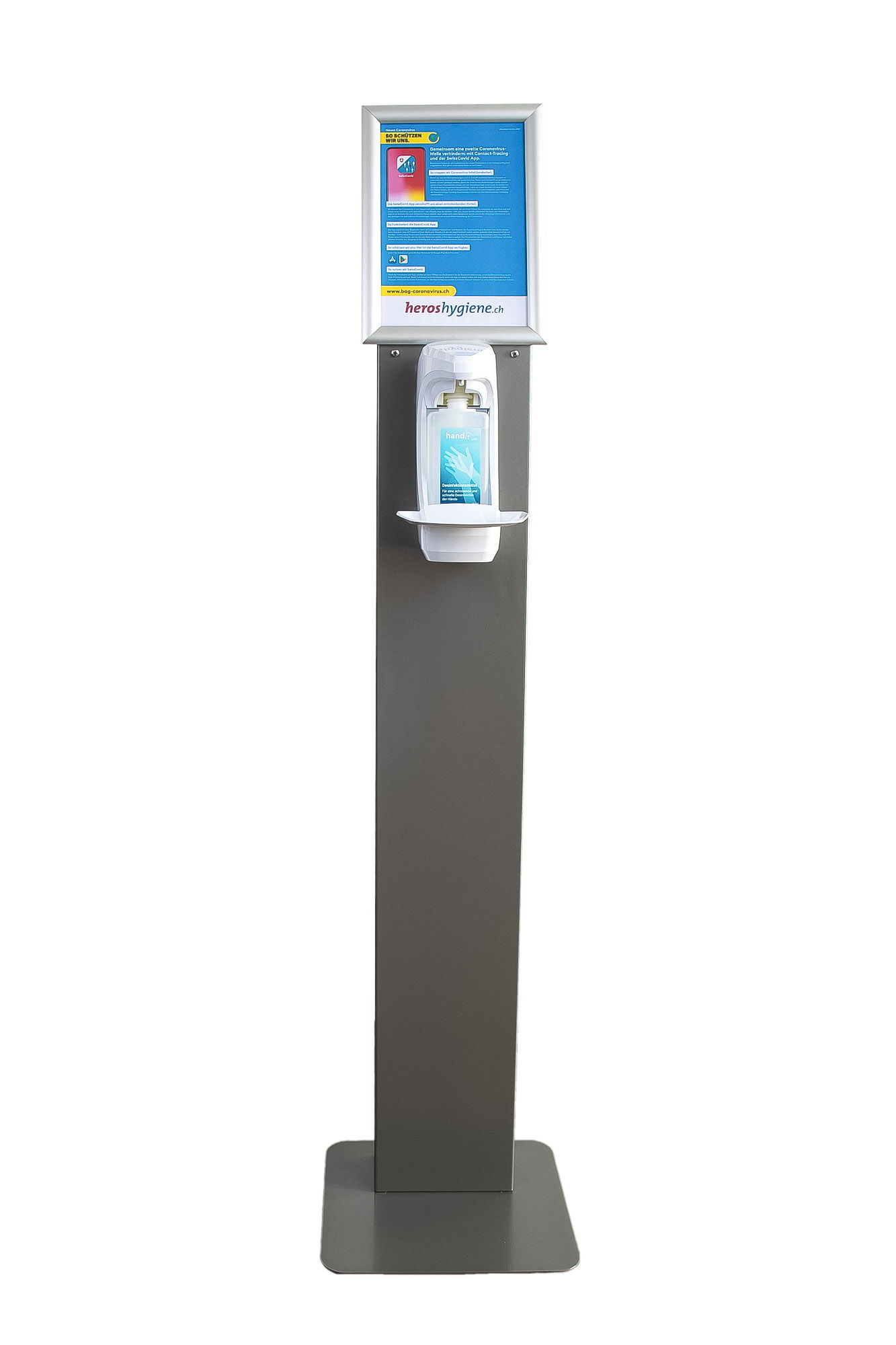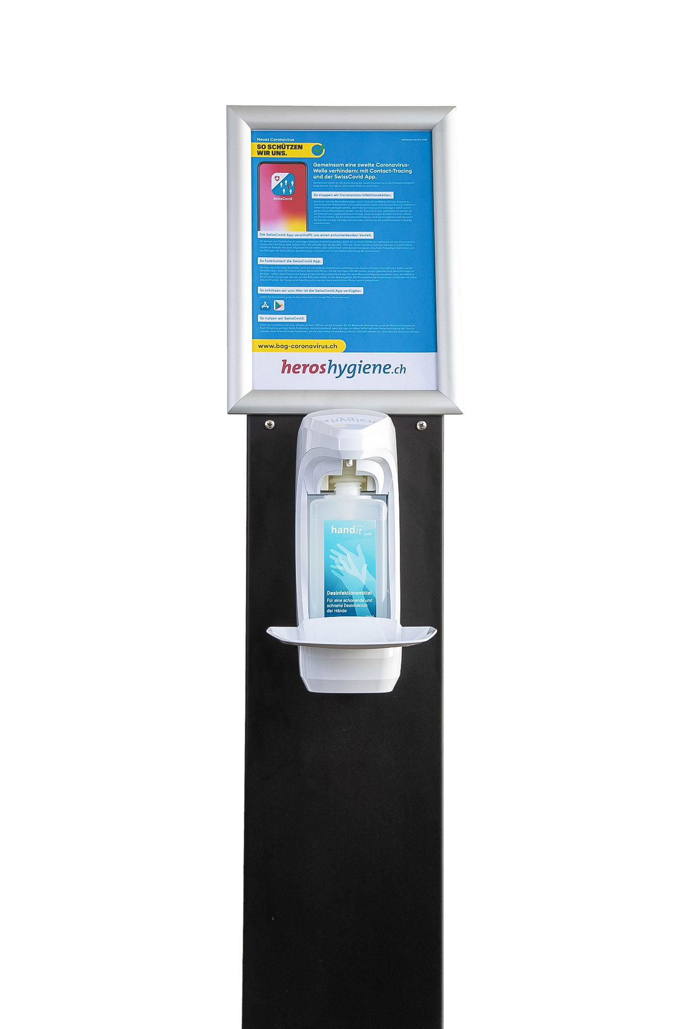 La nostra colonna di disinfezione è realizzata in robusto acciaio inossidabile. La stazione di disinfezione è prodotta localmente in Svizzera ed è disponibile con verniciatura a polvere nei colori grigio, bianco e nero. La stazione di disinfezione è abbinata a un dispenser di disinfezione touchless di alta qualità per flaconi Euro da 500 ml. Con il suo design moderno, la nostra colonnina di disinfezione offre la soluzione elegante ideale per garantire i necessari standard di igiene negli spazi pubblici.