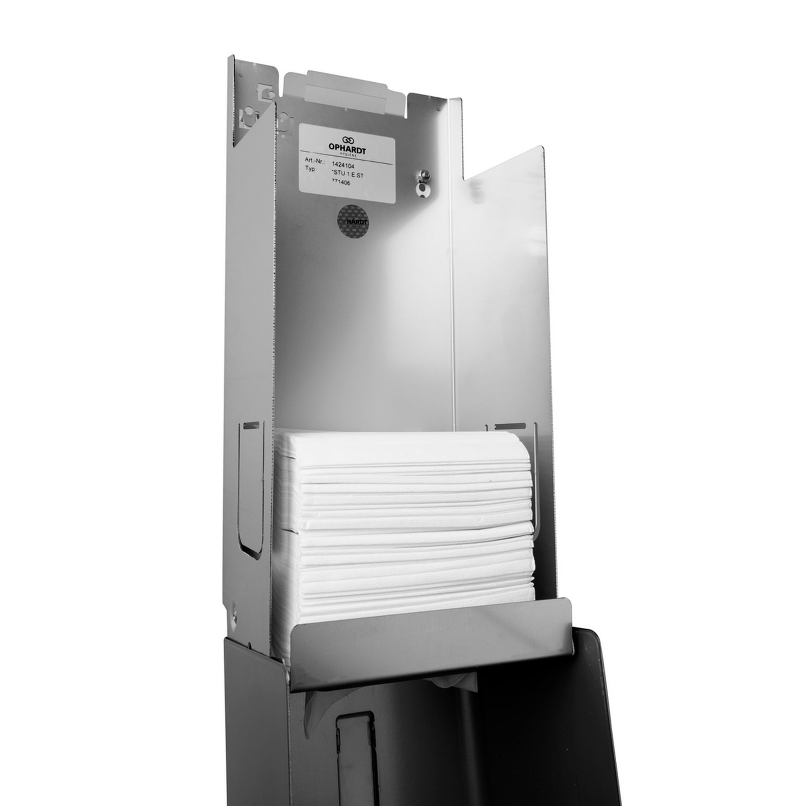 Il distributore di carta igienica a foglio singolo STU 1 di Ophardt Hygiene è realizzato in acciaio inox con rivestimento anti-impronta per 650 fogli. Il dispenser è dotato di uno scarico di pressione integrato per la pila di carta che consente un prelievo uniforme su tutta l'altezza di riempimento. È dotato di un meccanismo di rimozione estremamente robusto in acciaio inox goffrato. L'alloggiamento con tetto inclinato impedisce il deposito di oggetti estranei sul dispenser.