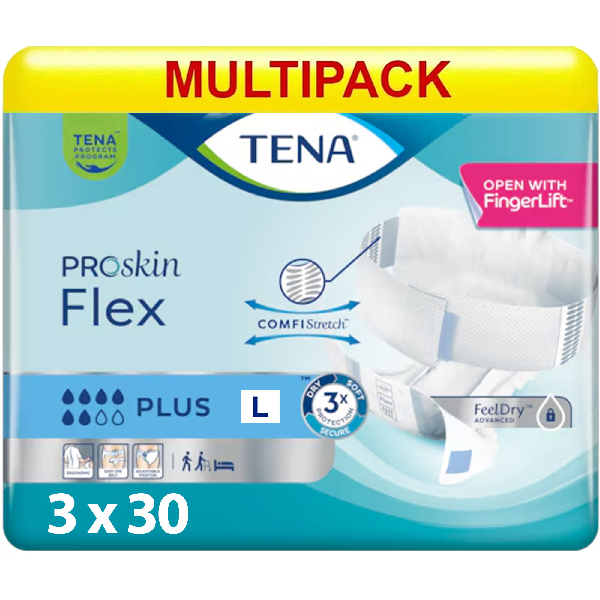 TENA ProSkin Flex Plus è un assorbente per incontinenza particolarmente assorbente, con una fascia elastica in vita, per le persone con incontinenza grave. Il prodotto è stato sviluppato per rendere il cambio più rapido ed ergonomico per gli assistenti, offrendo al contempo un elevato livello di sicurezza per la persona interessata. La morbida fascia COMFIStretch si adatta in modo flessibile alle diverse forme del corpo e favorisce una vestibilità comoda e aderente, con una protezione affidabile dalle perdite. La chiusura può essere chiusa sul davanti, regolata individualmente e, se necessario, aperta e chiusa più volte senza perdere il sostegno. Grazie al FingerLift, l'apertura della cintura è immediatamente accessibile, rendendo molto più facile indossare l'indumento quando si è in piedi o sdraiati e da davanti o da dietro. FeelDry Advanced assicura un rapido assorbimento, pelle asciutta e tripla protezione per una pelle sana.