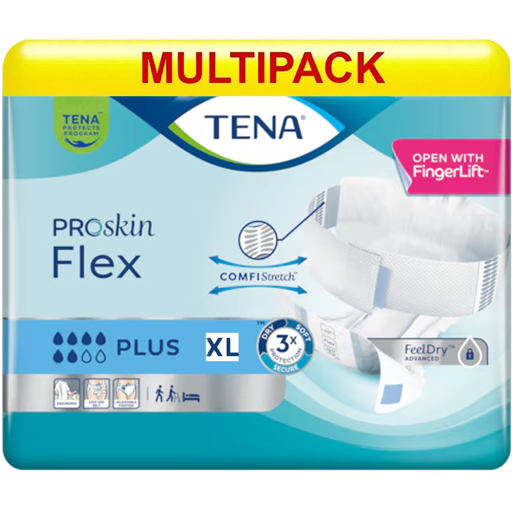 TENA ProSkin Flex Plus è un assorbente per incontinenza particolarmente assorbente, con una fascia elastica in vita, per le persone con incontinenza grave. Il prodotto è stato sviluppato per rendere il cambio più rapido ed ergonomico per gli assistenti, offrendo al contempo un elevato livello di sicurezza per la persona interessata. La morbida fascia COMFIStretch si adatta in modo flessibile alle diverse forme del corpo e favorisce una vestibilità comoda e aderente, con una protezione affidabile dalle perdite. La chiusura può essere chiusa sul davanti, regolata individualmente e, se necessario, aperta e chiusa più volte senza perdere il sostegno. Grazie al FingerLift, l'apertura della cintura è immediatamente accessibile, rendendo molto più facile indossare l'indumento quando si è in piedi o sdraiati e da davanti o da dietro. FeelDry Advanced assicura un rapido assorbimento, pelle asciutta e tripla protezione per una pelle sana.