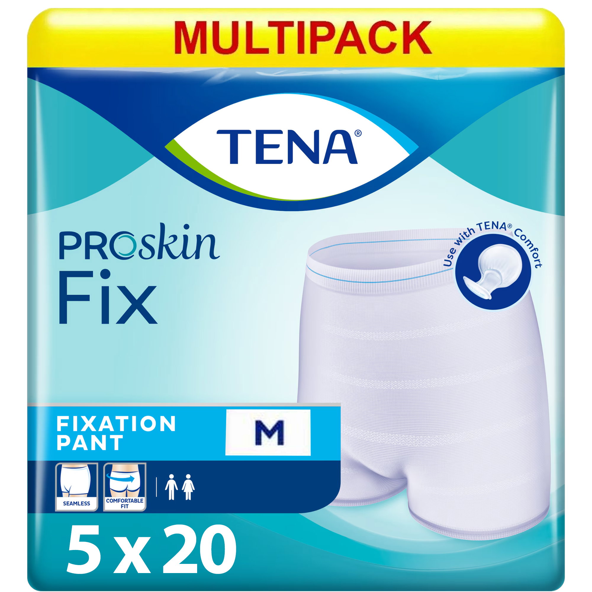 TENA Fix sono pantaloni di fissaggio per incontinenza riutilizzabili e traspiranti, per il fissaggio sicuro di prodotti per incontinenza preformati di grandi dimensioni, come TENA Comfort. Il design senza cuciture assicura una vestibilità discreta e aiuta a minimizzare i punti di pressione, per mantenere il comfort durante il giorno e la notte. Grazie all'ampia gamma di taglie, dalla XS alla 3XL, è possibile una vestibilità personalizzata, che favorisce anche la protezione dalle perdite. I pantaloni di fissaggio sono lavabili, dimensionalmente stabili e progettati per l'uso nella cura quotidiana o a casa.
