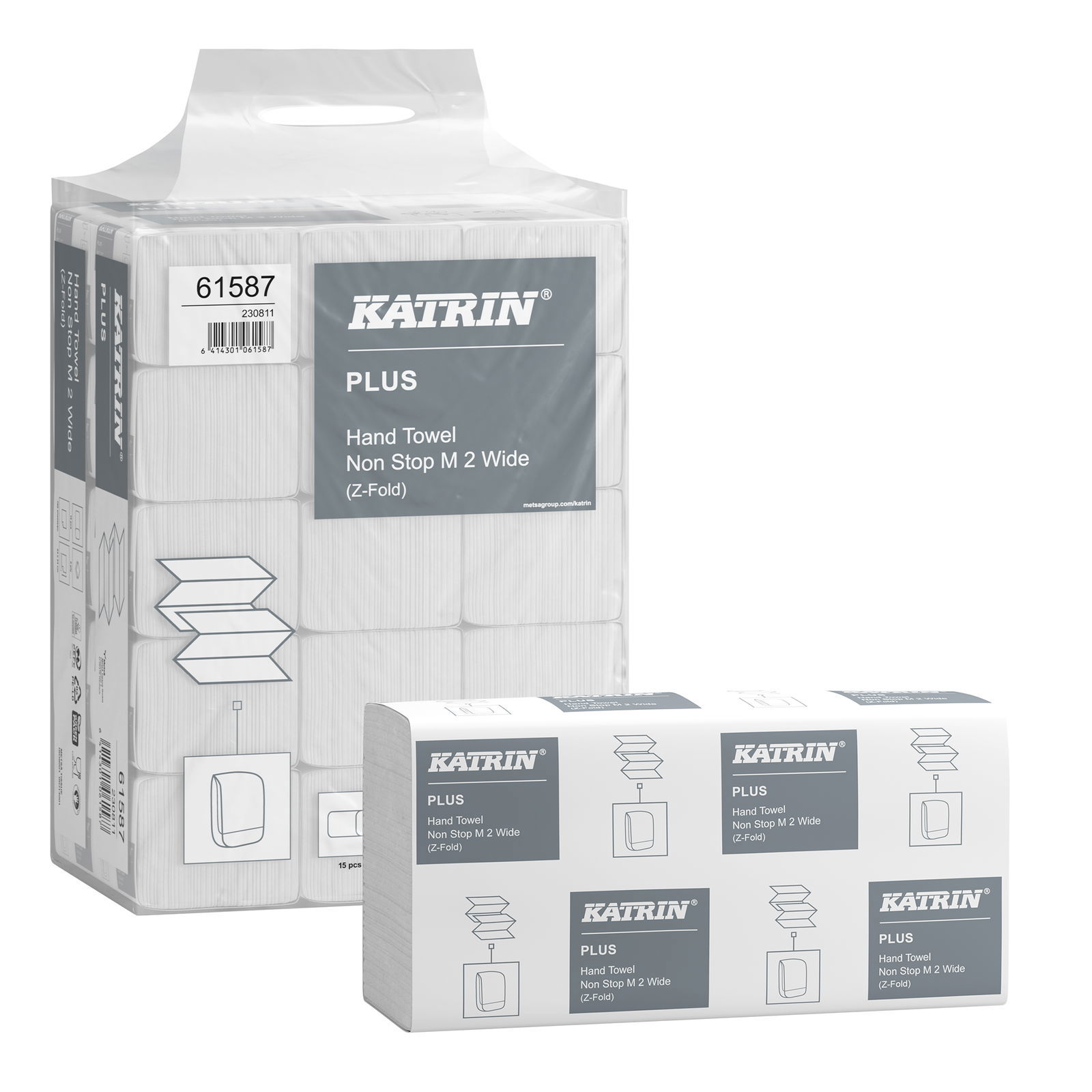 Die Katrin Plus Z-Falz Falthandtücher Non Stop M Wide bieten höchste Qualität für hygienisches und komfortables Händetrocknen. Sie bestehen aus weichem, hochweissem Papier mit 2 Lagen, das durch seine Reissfestigkeit und Saugfähigkeit überzeugt. So wird das Abtrocknen der Hände effektiv, sanft und angenehm.
